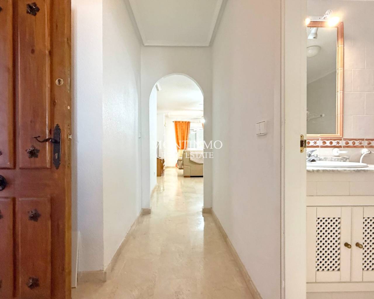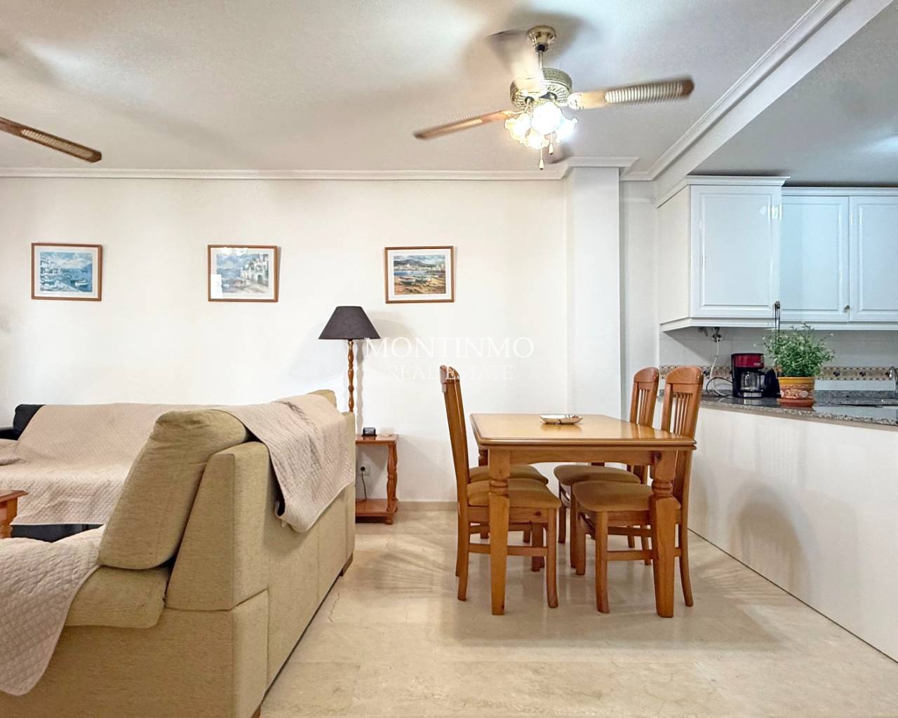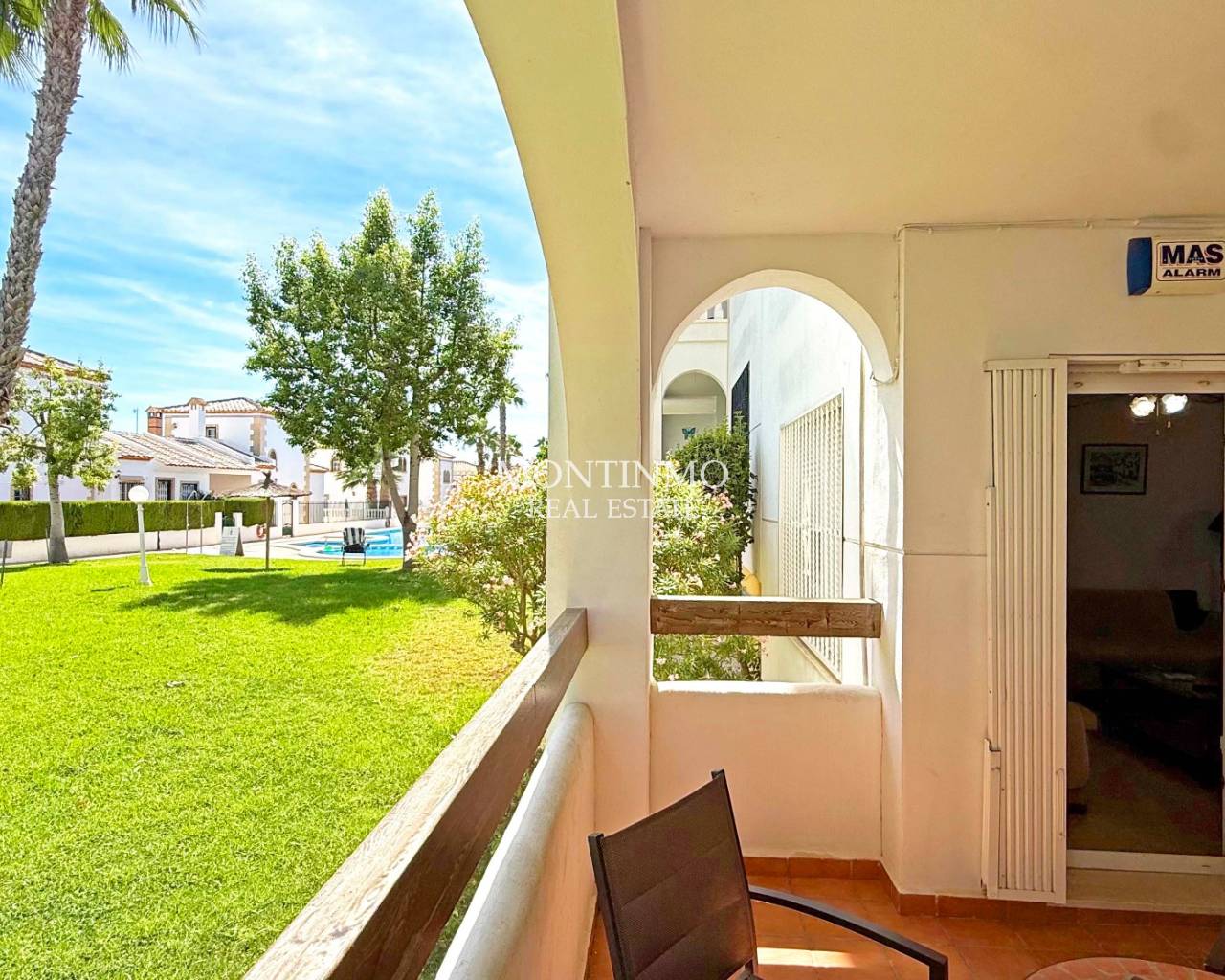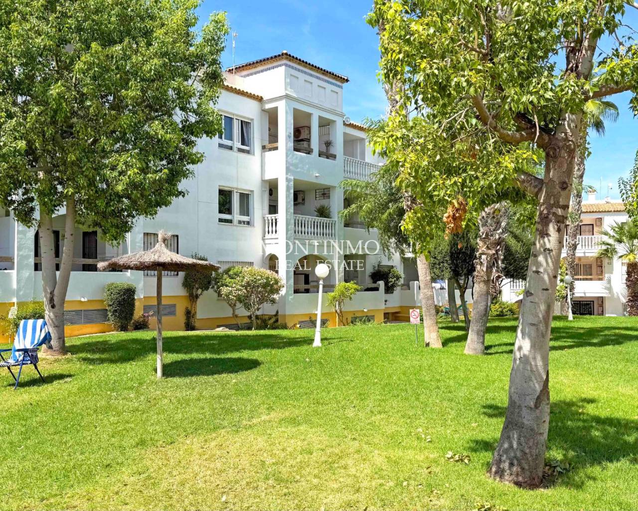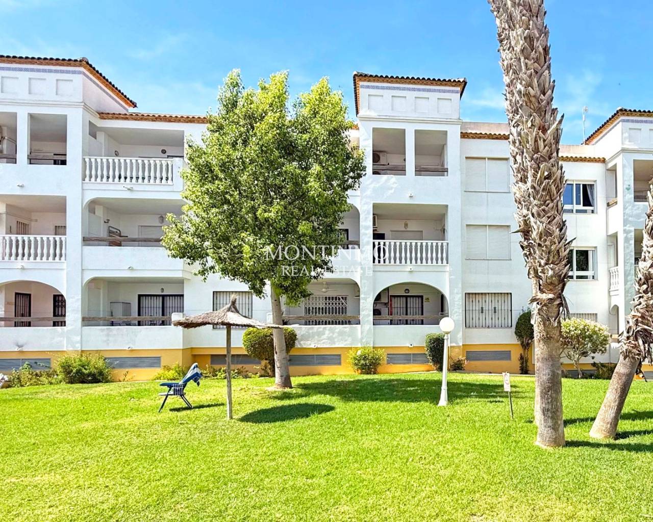 We present this charming ground floor apartment located in the sought-after residential complex Las Violetas, just steps away from the famous Villamartín Plaza and golf course. The property offers 2 bedrooms and 2 bathrooms, including one en-suite, a bright and spacious open-plan living room with dining area, and a sunny balcony perfect for relaxing. It comes fully furnished and equipped with air conditioning, ready to move into. Additional features include underground parking and a private storage room, providing convenience and security. The well-maintained community boasts beautiful gardens and a communal swimming pool for residents to enjoy. With its unbeatable location across from Villamartín Plaza—with its wide choice of restaurants, bars, and shops—and just minutes from the golf club and the sandy beaches of Orihuela Costa, this apartment is an ideal holiday home, rental investment, or permanent residence.