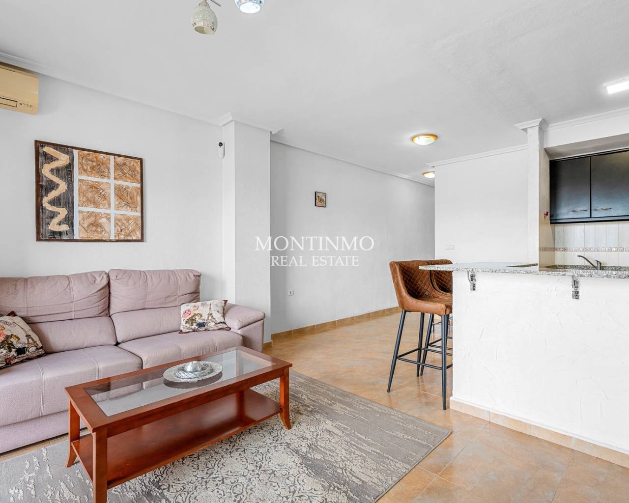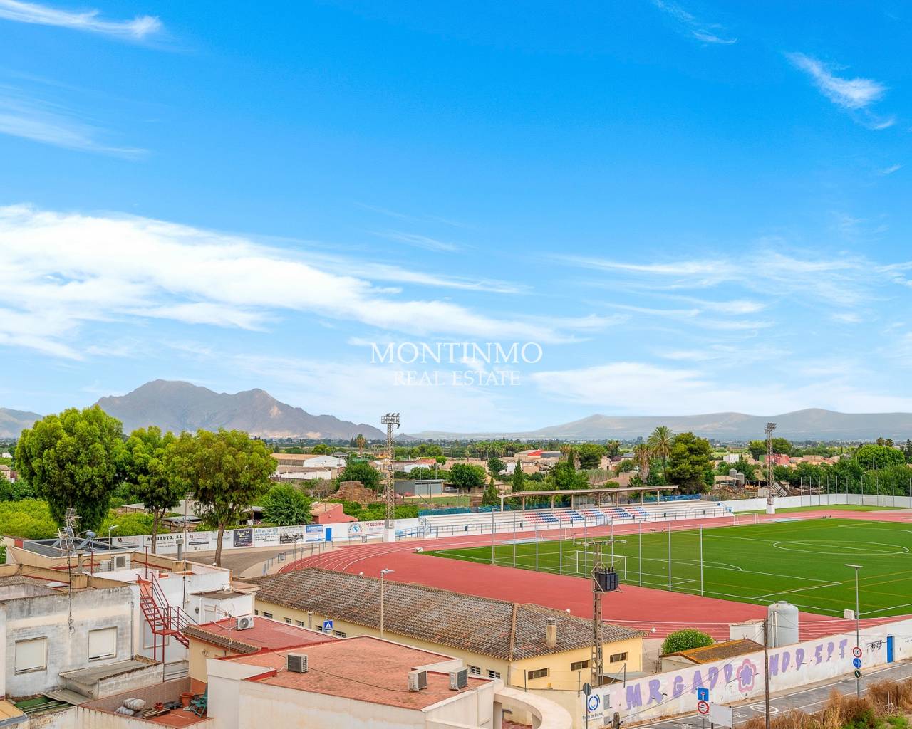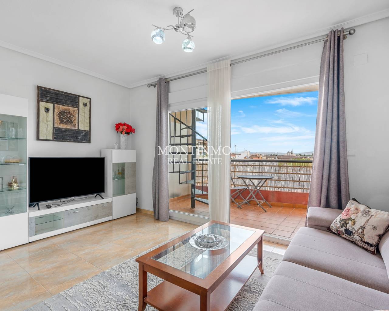 Este encantador piso de 69 m² construidos y 65 m² útiles ofrece una distribución práctica y acogedora, ideal tanto como vivienda habitual como para escapadas o inversión. Al entrar, un recibidor conecta con dos dormitorios dobles bien ventilados y un baño completo situado entre ambos. La zona de día se compone de un amplio salón-comedor con cocina abierta, un espacio luminoso y versátil perfecto para relajarse o disfrutar con invitados. Desde el salón se accede a un balcón privado, desde donde una escalera de caracol lleva directamente a un solárium de uso exclusivo de 27 m². Este espacio exterior ofrece múltiples posibilidades: zona chill-out, comedor al aire libre, rincón de lectura o simplemente un lugar donde disfrutar del sol. Además, en la misma planta del solárium, se encuentra la piscina comunitaria en la azotea, una característica poco habitual en la zona que aporta un toque exclusivo a la vivienda. La propiedad, orientada al suroeste, goza de excelente luz natural durante todo el día. Construida en 2006, incluye aire acondicionado y armarios empotrados, y se encuentra en una comunidad bien cuidada. Su combinación de espacios interiores cómodos y zonas exteriores privadas hacen de este piso una oportunidad única para vivir o veranear en Almoradí.