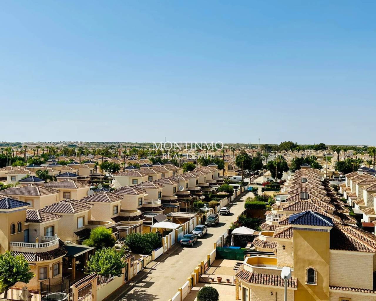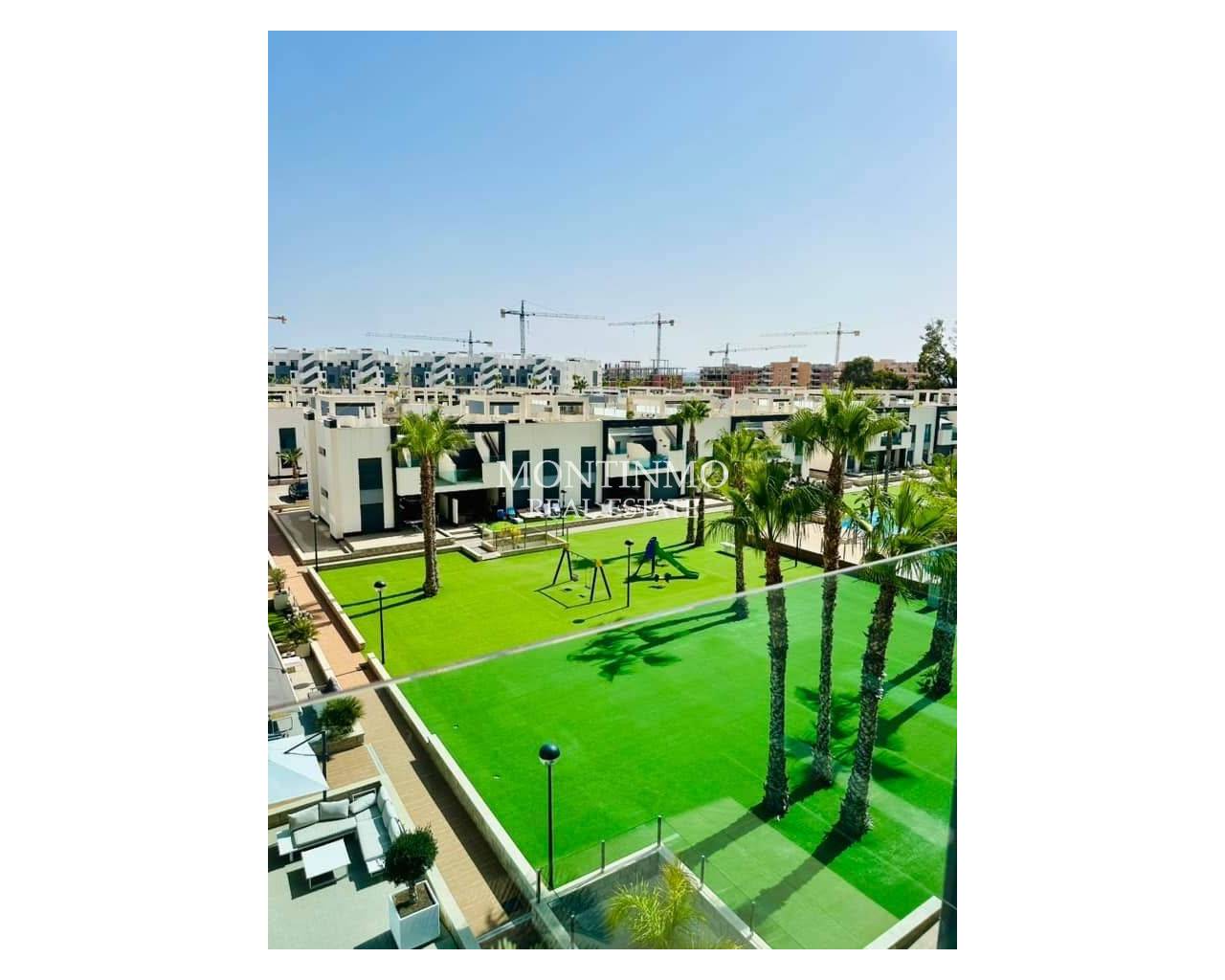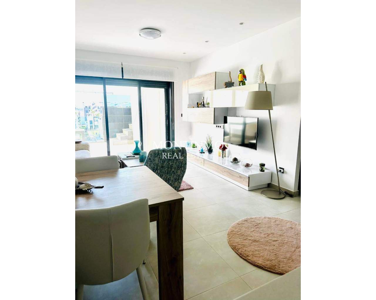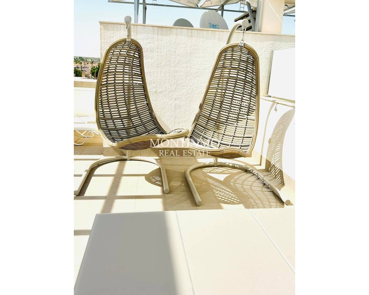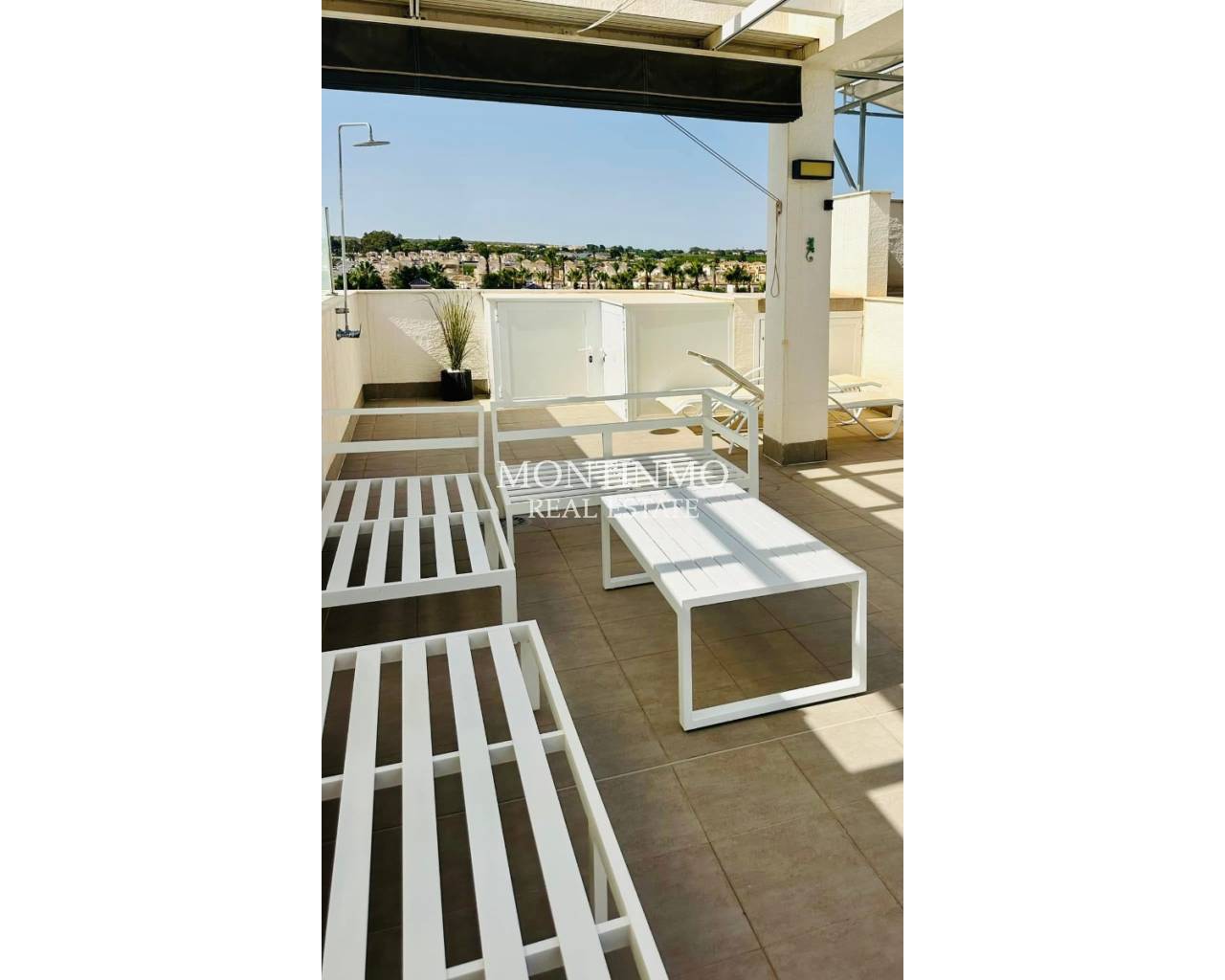 Descubra este espectacular ático moderno con solárium privado en la azotea, idealmente situado en una tranquila zona residencial rodeada de palmeras y naturaleza, y al mismo tiempo a poca distancia a pie de restaurantes, tiendas y todos los servicios necesarios para el día a día. Construido en 2017, esta elegante propiedad combina perfectamente confort, amplitud y estilo de vida mediterráneo, lo que la convierte en una opción ideal como residencia habitual, vivienda vacacional o inversión de calidad en la Costa Blanca. Un espacio de vida luminoso y amplio Ubicado en la tercera y última planta de un edificio moderno con ascensor, el ático le recibe con un luminoso hall de entrada que conduce a un amplio salón-comedor de concepto abierto con una moderna cocina totalmente equipada. Los grandes ventanales y los techos altos permiten la entrada de abundante luz natural, creando una atmósfera agradable, abierta y muy luminosa. Desde el salón se accede directamente a una terraza orientada al sur, con agradables vistas a los jardines de palmeras y a la piscina comunitaria, el lugar perfecto para disfrutar del sol mediterráneo. Dormitorios confortables y características modernas La vivienda dispone de dos amplios dormitorios dobles con armarios empotrados, incluyendo un dormitorio principal con baño en suite. Para garantizar el máximo confort durante todo el año, el ático cuenta con: Aire acondicionado por conductos en toda la vivienda Suelo radiante en los baños Acabados de alta calidad y diseño moderno Impresionante solárium privado Uno de los grandes atractivos de esta propiedad es su amplio solárium privado de 67 m² situado en la planta superior. Desde este espacio podrá disfrutar de vistas abiertas a los jardines y a la zona de piscina, siendo el lugar ideal para: Tomar el sol Comer o cenar al aire libre Disfrutar con familia y amigos Relajarse bajo el sol de España Aparcamiento privado y trastero La propiedad también incluye: Plaza de aparcamiento privada en garaje subterráneo, con espacio para coche y bicicletas Amplio trastero privado Instalaciones comunitarias tipo resort Los residentes de esta comunidad privada y cerrada disfrutan de una amplia gama de instalaciones pensadas para el ocio y la relajación: Dos grandes piscinas comunitarias Hermosos jardines tropicales con palmeras Zona de juegos infantiles Mini golf Zona de fitness al aire libre Pista de petanca Área de spa con jacuzzi y sauna (incluyendo sauna infrarroja) Ubicación excepcional cerca de la Laguna Salada de La Mata El ático se encuentra cerca de la famosa Laguna Salada de La Mata, una zona reconocida por la Organización Mundial de la Salud como uno de los microclimas más saludables del mundo. Este entorno único es especialmente beneficioso para personas con problemas respiratorios, alergias, asma o enfermedades reumáticas. A poca distancia a pie encontrará: Restaurantes y bares Un mini supermercado Un mercado semanal los domingos a solo 5 minutos Las hermosas playas de arena de Guardamar del Segura se encuentran a tan solo 3 km.
