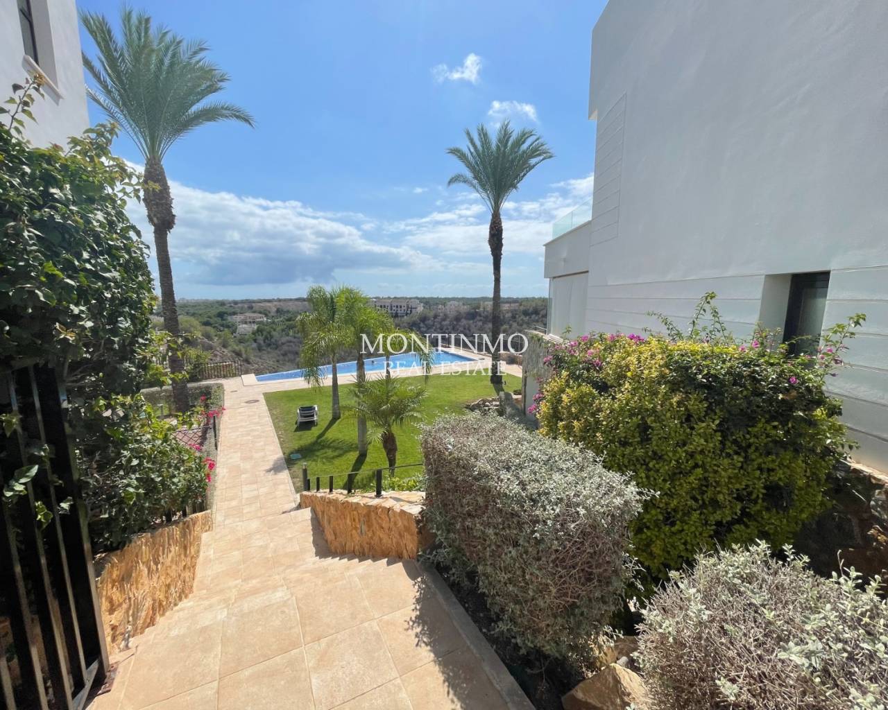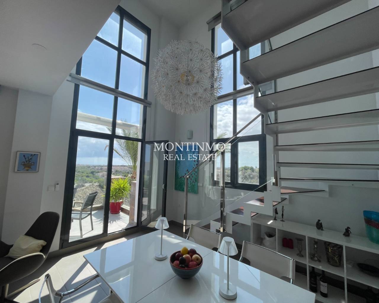 Este ático dúplex de tres dormitorios con orientación sureste en Las Ramblas Golf se encuentra junto a este prestigioso campo de golf, lindando también con Campoamor Golf. A un corto trayecto en coche se encuentran Villamartín, el popular centro comercial La Zenia Boulevard y las hermosas playas de Orihuela Costa, a unos 10 minutos. Esta impresionante casa de diseño arquitectónico moderno ofrece 97 m² distribuidos en dos plantas, con una ubicación elevada y vistas increíbles, pero con acceso cómodo a la sala de estar principal desde la planta baja. El luminoso salón-comedor cuenta con dos puertas correderas acristaladas que dan a la terraza, con una parte de la estancia con techo abovedado y una escalera abierta ultramoderna que permite apreciar plenamente las espectaculares vistas abiertas a través del ventanal de suelo a techo. Una cocina bien equipada con barra americana, dos dormitorios dobles y un baño familiar con ducha completan esta planta. La primera planta alberga el dormitorio principal con baño en suite y acceso directo a una impresionante terraza en forma de L, equipada con toldo retráctil y prácticos armarios de almacenamiento: el lugar perfecto para relajarse y disfrutar de las vistas. Ubicada en una comunidad impecablemente cuidada y bien presentada, los residentes disfrutan de una impresionante piscina comunitaria infinita y aparcamiento privado. Los extras incluyen aire acondicionado. Una propiedad verdaderamente excepcional donde "impresionante" no es suficiente para describir las cualidades y el lujo que ofrece esta casa en la Costa Blanca Sur.